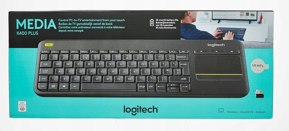 Konfiguracja klawiatury K400 Plus jest wyjątkowo prosta. Podłącz niewielki odbiornik Unifying do portu USB i zacznij zabawę.Odbiornik klawiatury umożliwia podłączenie do komputera nawet sześciu urządzeń Unifying.