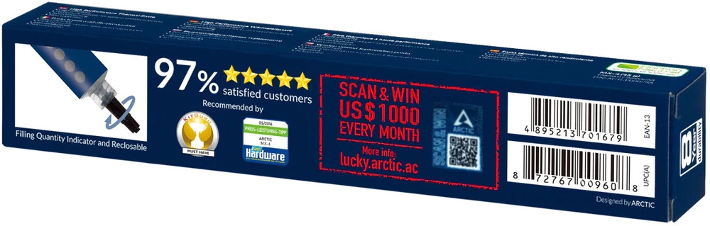 Pasta termiczna ARCTIC MX-4 składa się z mikrocząstek węgla, które wypełniają te ubytki. Prowadzi to do wyjątkowo wysokiej przewodności cieplnej, gwarantując szybkie i wydajne odprowadzanie ciepła z CPU lub GPU. Dzięki wyjątkowej wydajności MX-4 jest nie tylko doskonałym wyborem dla overclockerów i entuzjastów, ale także dla innych zastosowań, które wymagają przenoszenia ciepła. Dzięki swojej konsystencji MX-4 jest łatwy w aplikacji nawet dla początkujących.