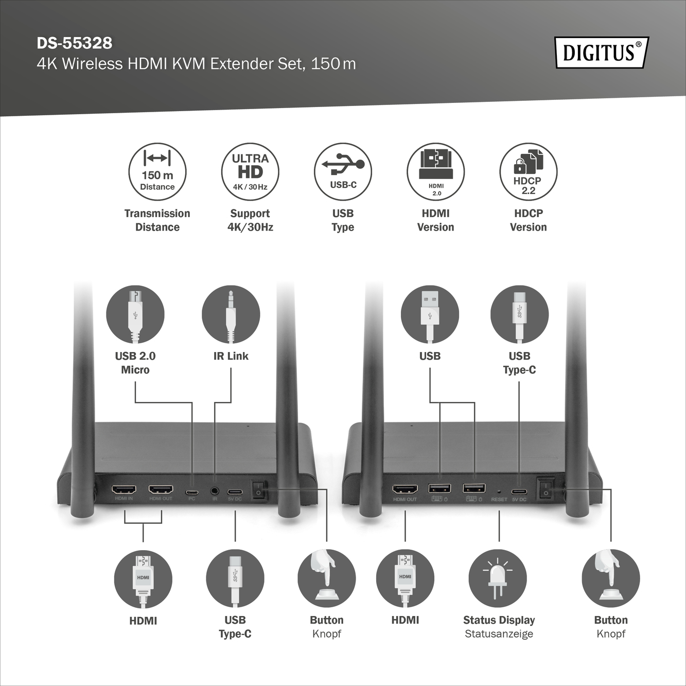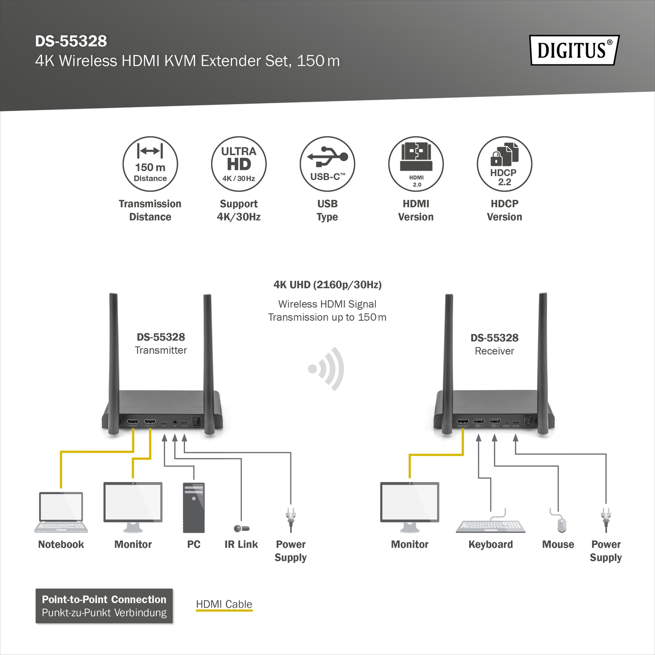 Przesyła bezprzewodowo sygnały wideo i audio HDMI w UHD 4K / 30 Hz na odległość do 150 m przy braku przeszkód w linii prostej i zapewnia funkcjonalność KVM